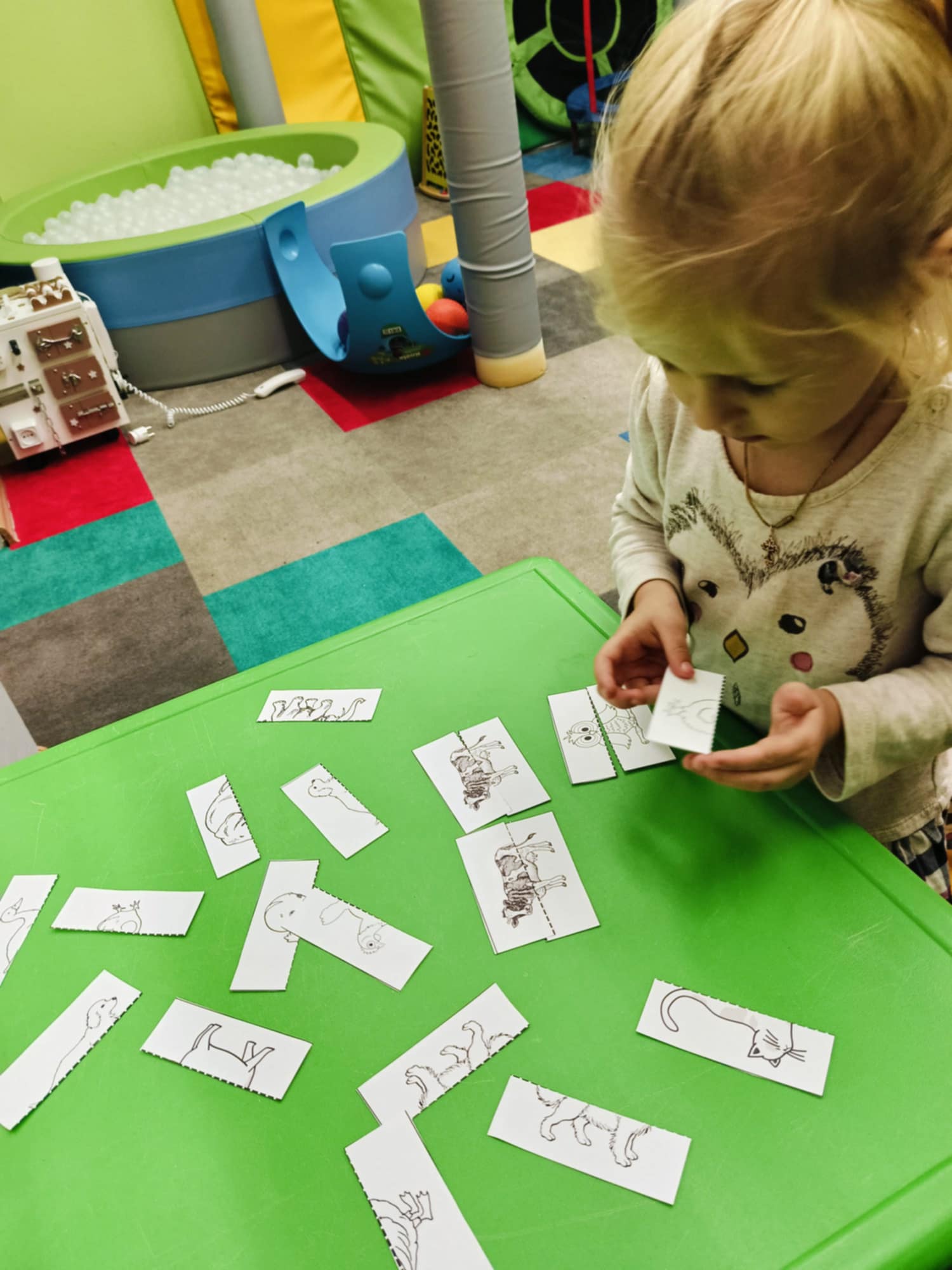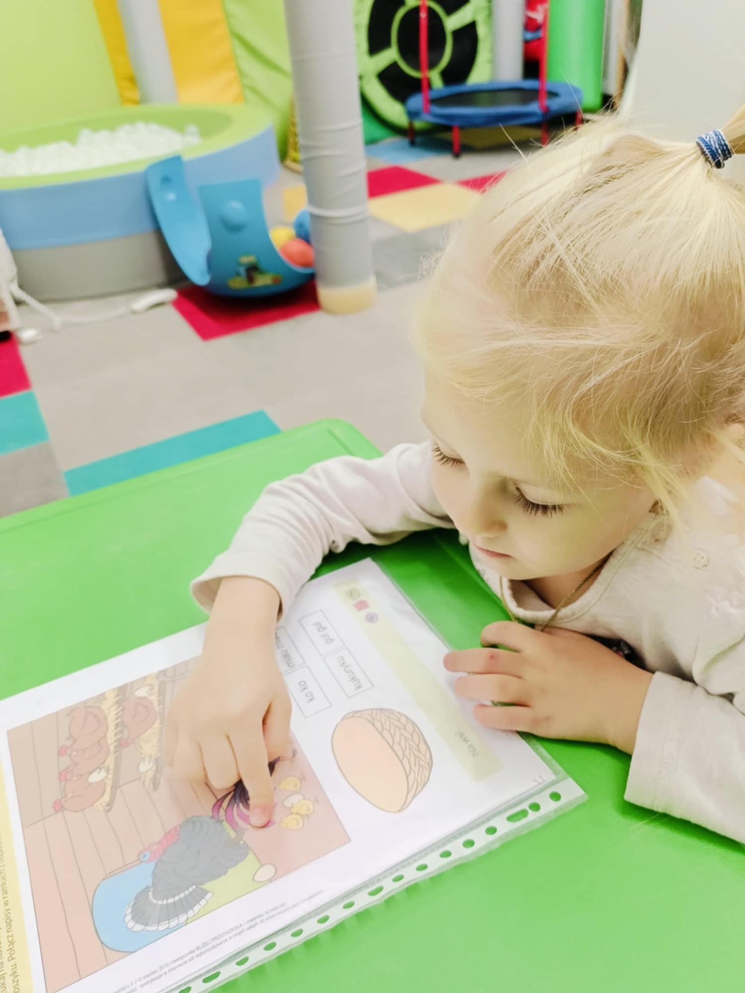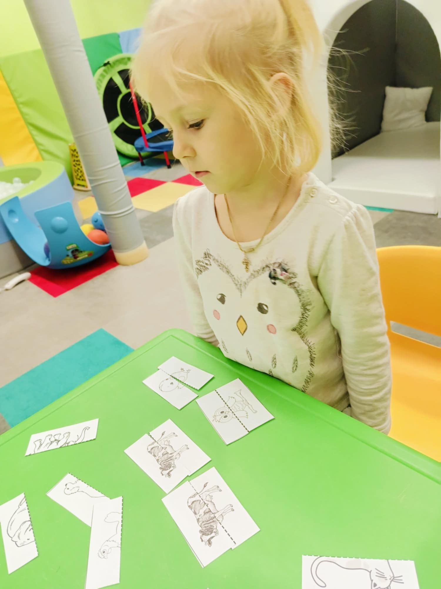 Podczas zajęć rewalidacyjnych ćwiczyliśmy narządy artykulacyjne, koncentrując się na prawidłowej wymowie samogłosek. Realizowaliśmy również zabawy dźwiękonaśladowcze, naśladując odgłosy zwierząt i utrwalając ich nazwy. Zajęcia obejmowały także ćwiczenia rozwijające analizę i syntezę wzrokową, wspierając percepcję i koncentrację dziecka.