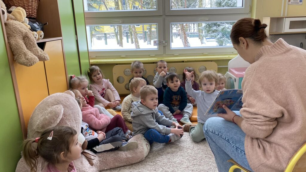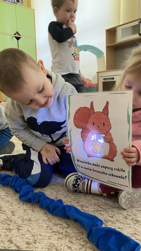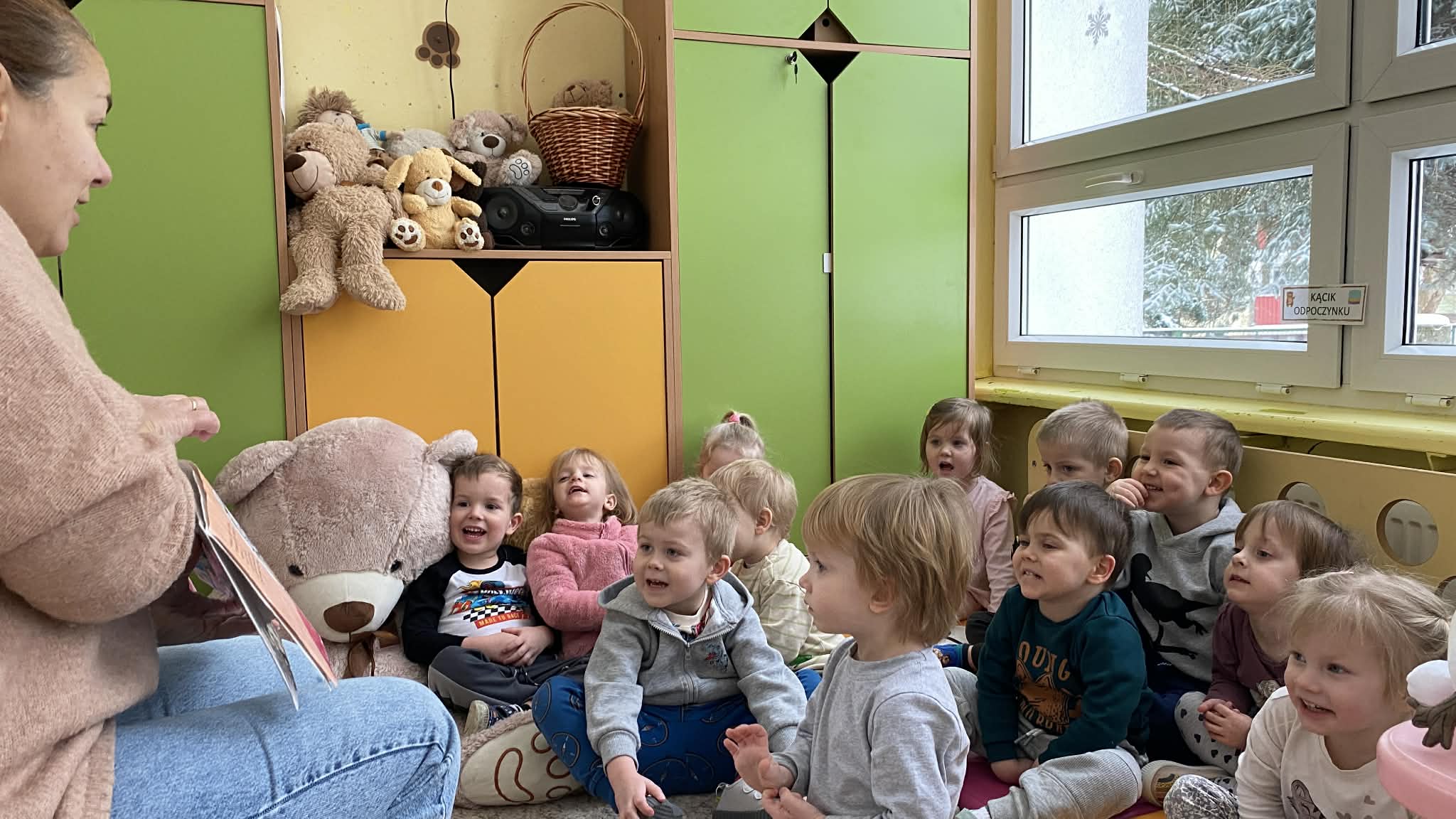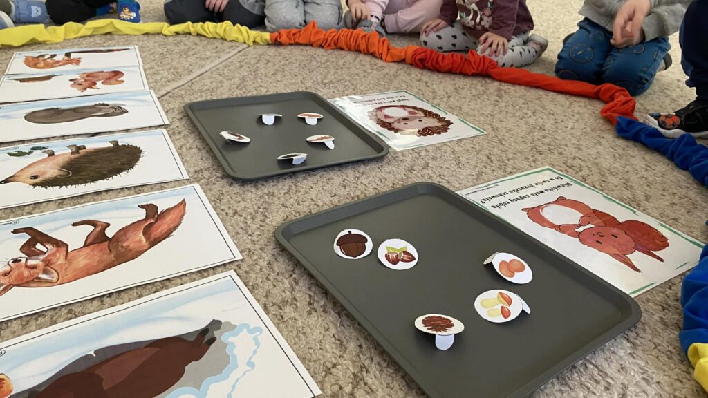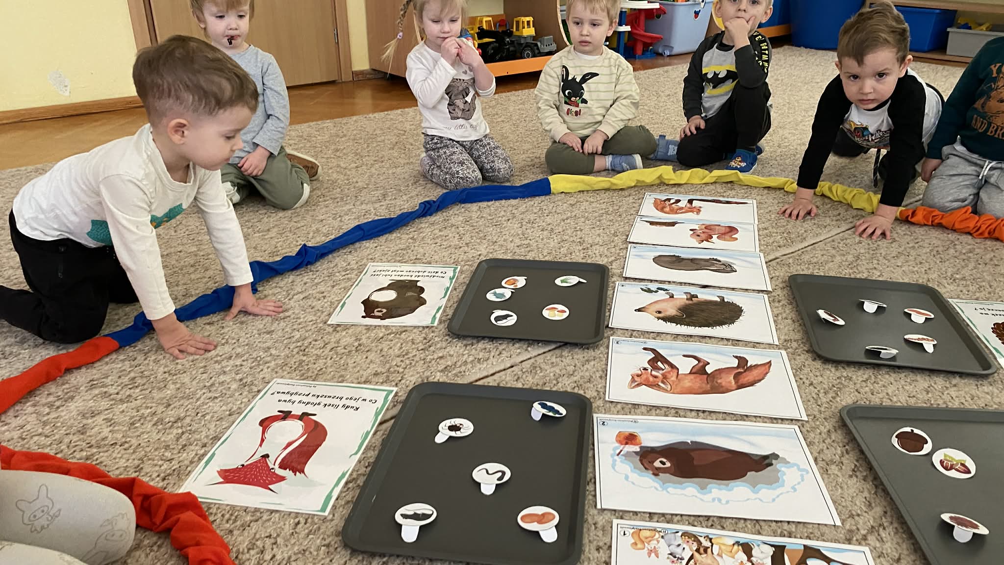 Rozmawialiśmy o tym, kto zapada w głęboki sen, kto zmienia kolor futerka, a komu warto zostawić ziarenka w karmniku. Przedszkolaki z dużym zaangażowaniem uczyły się rozpoznawać ślady na śniegu i sprawdzały, czy niedźwiedź naprawdę chrapie do wiosny.